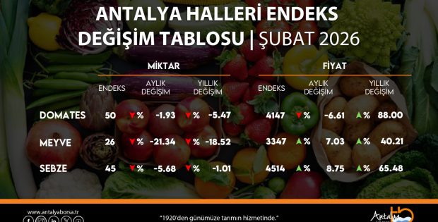 Antalya Ticaret Borsası, şubat ayı hal endeksini açıkladı. Domates miktar endeksi yıllık yüzde 5,47 azaldı, fiyat endeksi yüzde 88 arttı. Meyve miktar endeksi yıllık yüzde 18,52 azaldı, fiyat