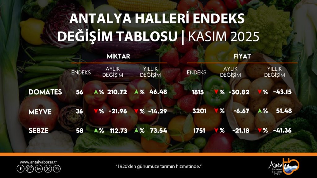 Antalya Ticaret Borsası Kasım Ayı Hal Endeksi’ni açıkladı. Antalya hallerinde işlem gören domates, meyve ve sebze işlem miktar ve fiyatlarına ait endeks değerleri, 2025 Kasım ayında miktar endeksleri domateste 56, meyvede 36 ve sebzede 58, fiyat endeksleri ise domateste 1815, meyvede 3201 ve sebzede 1751 olarak gerçekleşti.