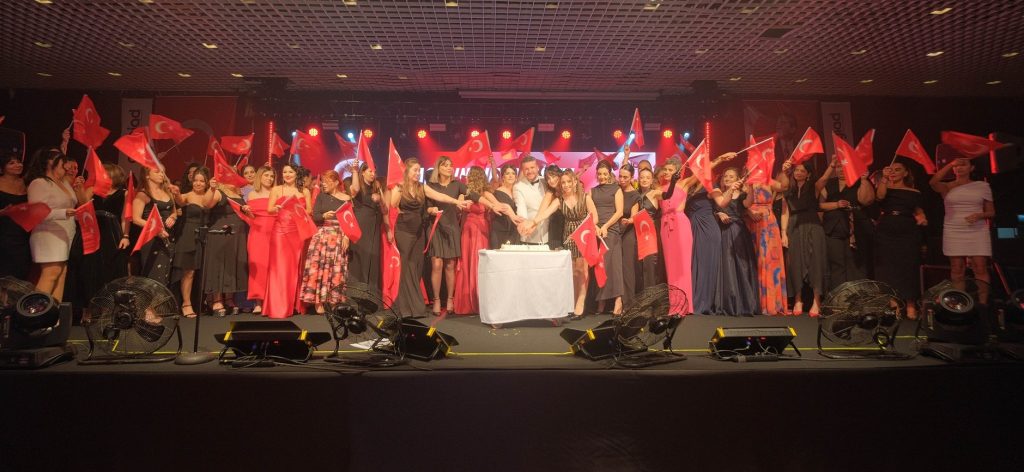 Gecede ünlü sanatçı Derya Uluğ sahne aldı ve konuklara unutulmaz bir müzik şöleni yaşattı. Katılımcılar Türk bayraklarıyla marşlar söyledi, salonda Cumhuriyet’in ışıltısı ve Atatürk sevgisi yankılandı.