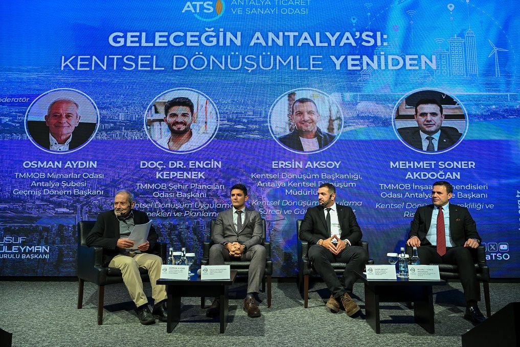 Antalya Ticaret ve Sanayi Odası (ATSO) tarafından düzenlenen “Geleceğin Antalya’sı: Kentsel Dönüşümle Yeniden” paneli, ATSO Yönetim Kurulu Başkanı Yusuf Hacısüleyman’ın ev sahipliğinde gerçekleştirildi. Antalya’nın geleceğini şekillendirecek kentsel dönüşüm politikalarının ele alındığı programa, Kumluca Belediye Başkanı Mesut Avcıoğlu, Çevre, Şehircilik ve İklim Değişikliği Bakanlığı, Kentsel Dönüşüm Başkanlığı, Riskli Yapılar Daire Başkanı Serdar Canikli, Türk Standartları Enstitüsü (TSE) Akdeniz Bölge Koordinatörü Hasan Demirtaş, Antalya Büyükşehir Belediyesi Başkan Başdanışmanı Dr. Cem Oğuz, Antalya Çevre, Şehircilik ve İklim Değişikliği İl Müdürü İsmail Öntaş, Antalya Ticaret İl Müdürü Halil Özşahan, akademisyenler, meslek odaları, kamu temsilcileri ile sektör paydaşları katıldı.