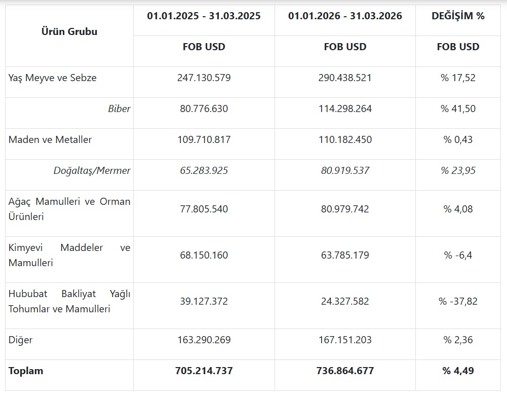 “Bölgemizden gerçekleşen ihracatın sektörlere göre dağılımına bakıldığında yaş meyve sebze sektörünün ilk beş içerisinde yine birinci sırada yer aldığı görülü. Yaş meyve sebze sektörü geçen yılın mart ayına kıyasla ihracatını ciddi oranda artırmayı başardı. Sektörün en fazla ihraç ettiği ürün, bu dönemde de biber oldu. Listenin ikinci sırasında maden ve metaller sektörümüz yer aldı. Sektörün sürükleyici ürünü yine doğaltaş oldu. Maden ve metaller sektörü, sektör bazında gerileme yaşarken, mermer ihracatımız artış sergiledi. Sektörlerin aylık bazda dağılımına bakıldığında dikkat çekici hususun demir ve demir dışı metaller sektörünün yeniden ilk beş arasına girmesi oldu.