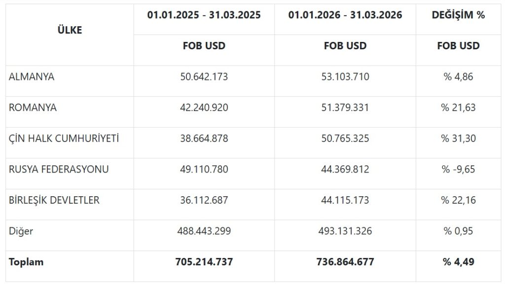 Bölgemizden Mart ayında 124 ülke ve bölgeye ihracat gerçekleştirildi. Bu tablo, bölge firmalarımızın dış ticaret alanında ne kadar öne çıktığını ve başarılı olduğunun da göstergesi oldu. Verilere bakıldığında 8 ülkede10 milyon dolar barajının aşıldığı, 45 ülkede ise 1 milyon dolar barajının aşıldığı görüldü. Romanya ilk defa aylık bazda en fazla ihracat gerçekleştirilen ülke oldu. En fazla ihracat yapılan ilk 5 ülke dışında yer alan diğer ülkelerde yüzde 50 ihracat artışı ve 11,6 milyon dolar ihracatla Bulgaristan, yüzde 67,62 oranında artış ve 10,2 milyon dolar ihracatla İspanya, yüzde 47,75 oranında artış ve 6,1 milyon dolar ihracatla yavru vatan KKTC dikkat çekti. Mart ayında Maldiv Adaları’na gerçekleşen ihracat yüzde 1263 oranında artarak, 5,3 milyon dolar oldu. Maldiv Adaları’na geride kalan aylarda da dikkat çekici ihracat gerçekleştirilmişti. Bu ay ihracat gerçekleştirilen ülkeler arasında en dikkat çekici olanı ise Bermuda oldu. 2025 yılında 400 bin dolarlık ihracatın gerçekleştirildiği Bermuda’ya Mart ayında 4 milyon dolarlık ihracat gerçekleşti.