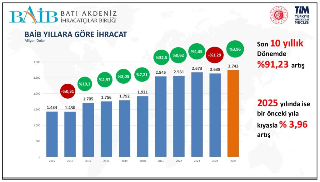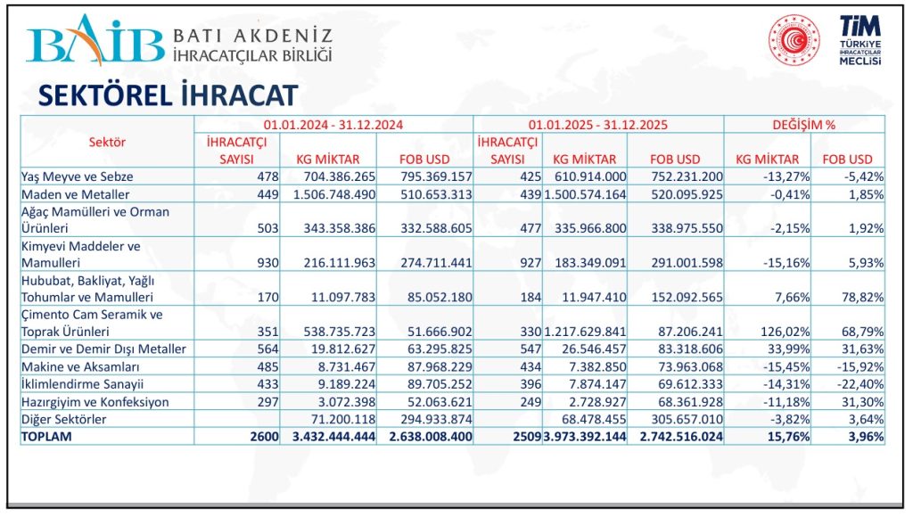 Batı Akdeniz ihracatı 2025 yılında bir önceki yıla oranla yüzde 3,96 oranında artarak 2 milyar 743 milyon dolara ulaştı ve tüm zamanların rekoru kırıldı.
