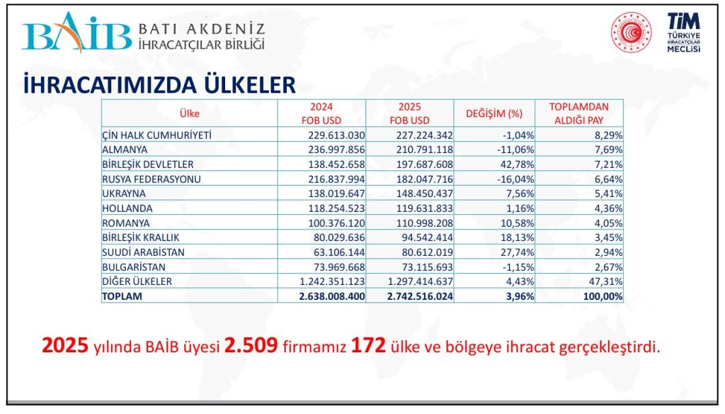 Toplantı kaldığı yerden devam ederken, bölge ihracat verilerini BAİB Başkan Yardımcısı Mustafa Küçükyaman açıkladı: “Türkiye’den 2025 yılında 273,4 Milyar Dolar ihracat yapıldı. Batı Akdeniz’den gerçekleşen ihracat ise 3,96 oranında artışla 2 Milyar 743 Milyon Dolar. Tüm zamanların rekorunu kırdık. Bu rakama ulaşmak çok sevindirici. Bir önceki yıl 2 Milyar 638 Milyon Dolar ihracat yapılmıştı. Zorlu koşullarda geçen 2025 yılında sağlanan ihracat artışı bölge için sevindirici.”