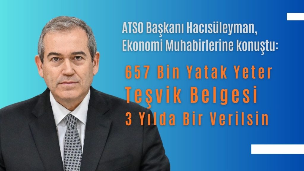 Antalya Ticaret ve Sanayi Odası (ATSO) Başkanı Yusuf Hacısüleyman, mevcut 657 bin turistik yatak kapasitesinin Antalya için yeterli olduğunu belirterek, “Bu yatak kapasitesi bize yeter. Hazineden aldığımız teşvik belgeleri var. KDV muafiyeti anlamını taşıyor. Bunlar üç yılda bir verilsin. Yoksa biz arzı birdenbire arttırdık bugüne kadar 50 bin yatak, 100 bin yatak, 80 bin yatak. Yeterince ziyaretçi gelmeyince fiyatları düşürdük. Bu duruma gelmeyelim. Biz artık tecrübesiz bir ülke değiliz” dedi.