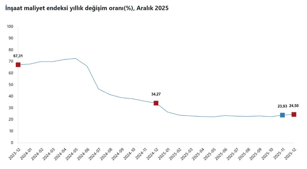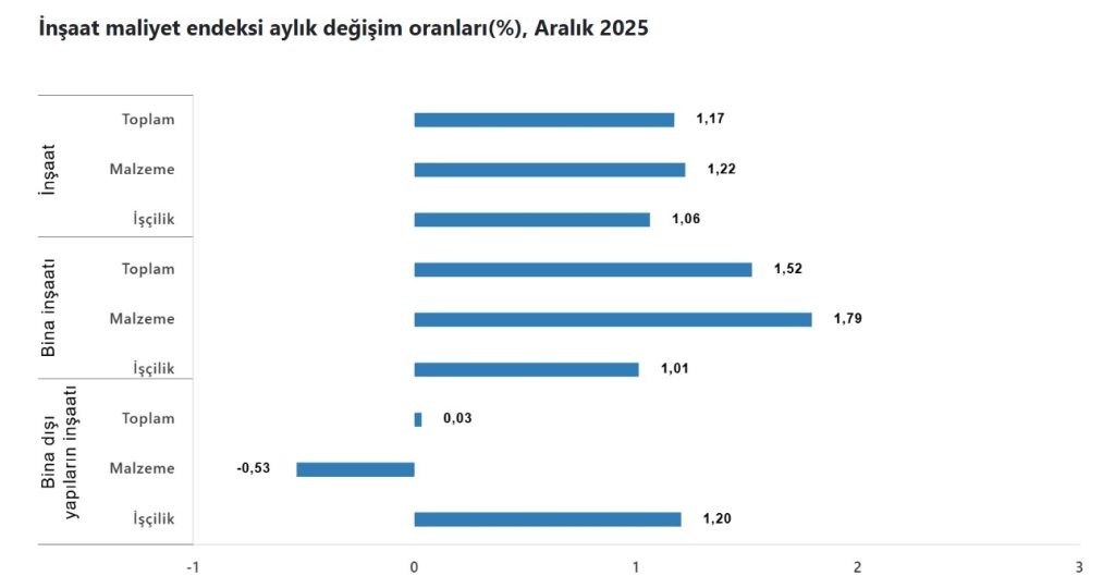 İnşaat maliyet endeksi, 2025 yılı Aralık ayında bir önceki aya göre %1,17 arttı, bir önceki yılın aynı ayına göre %24,50 arttı. Bir önceki aya göre malzeme endeksi %1,22 arttı, işçilik endeksi %1,06 arttı. Ayrıca bir önceki yılın aynı ayına göre malzeme endeksi %21,47 arttı, işçilik endeksi %30,67 arttı.