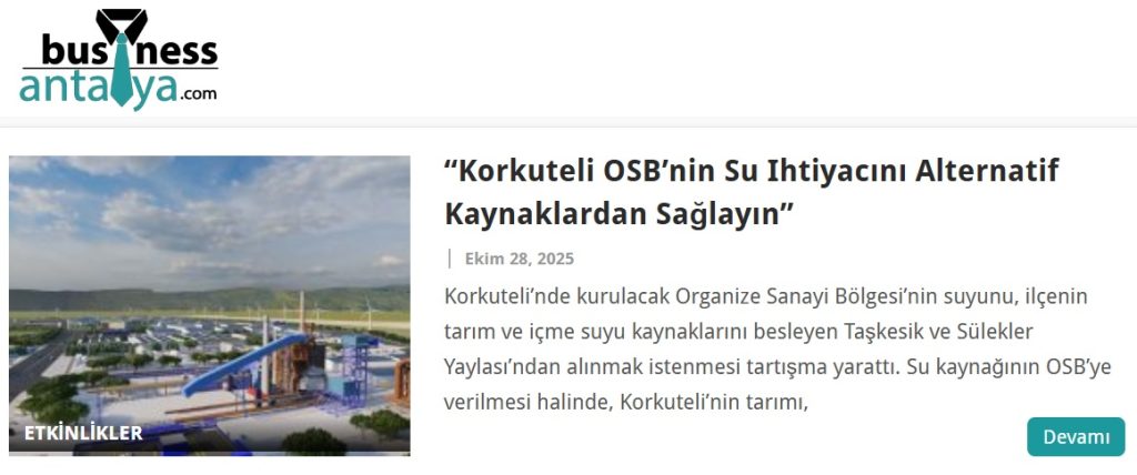 Korkuteli’nde kurulacak Organize Sanayi Bölgesi’nin suyunu, ilçenin tarım ve içme suyu kaynaklarını besleyen Taşkesik ve Sülekler Yaylası’ndan alınmak istenmesi büyük tartışma yaratmıştı. Su kaynağının OSB’ye verilmesi halinde, Korkuteli’nin tarımı, hayvancılığı, yaylakları ve doğasının büyük zarar göreceği iddia edilirken, Antalya Milletvekili Aykut Kaya ekim ayında konuyu Türkiye Büyük Millet Meclisi gündemine taşımıştı. MHP Korkuteli İlçe Başkanı Kaan Yurt da, Korkuteli Organize Sanayi Bölgesi için planlanan su temin projesinin, bölgedeki stratejik içme ve tarım suyu kaynakları üzerinde olumsuz etkiler taşıdığını belirterek, “Hazırladığımız rapora göre, OSB’nin su ihtiyacının Taşkesiği–Yeleme hattından karşılanması durumunda, Korkuteli’nin ekolojik dengesi, yeraltı su seviyeleri ve tarımsal üretimi açısından ciddi riskler ortaya çıkacaktır.” ifadesini kullanmıştı.