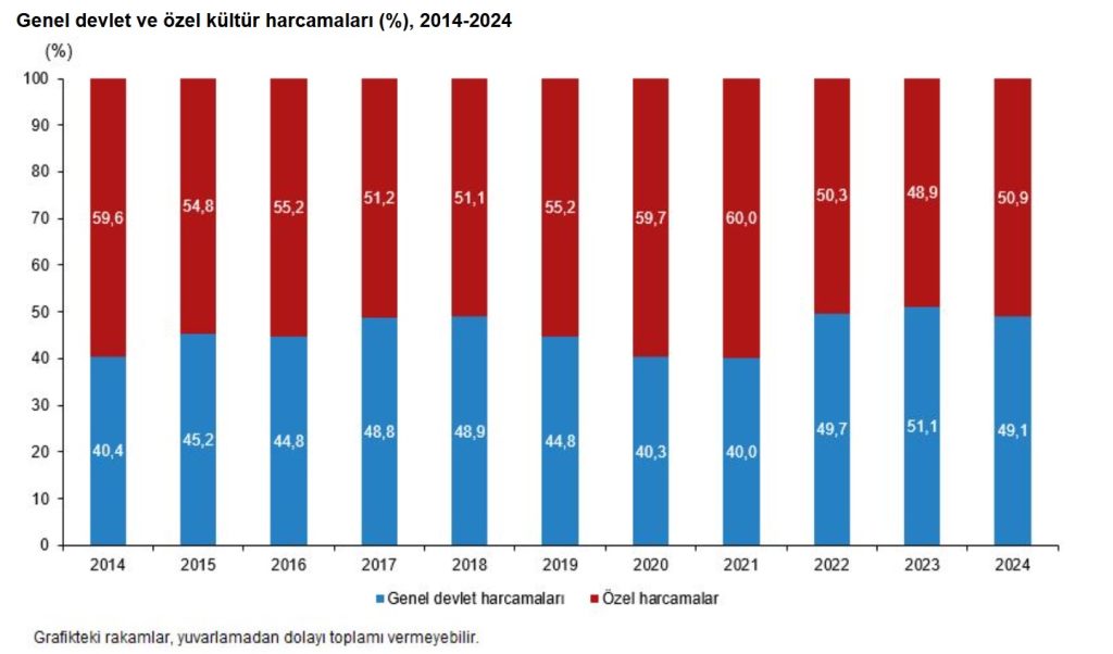 Toplam kültür harcamaları içinde genel devlet harcamalarının payı 2024 yılında %49,1 oldu. Genel devlet kültür harcamaları 2024 yılında önceki yıla göre %76,1 artarak 200 milyar 369 milyon 171 bin TL olurken, harcamaların %67,8’i merkezi devlet bütçesinden gerçekleşti. Genel devlet kültür harcamalarında en yüksek pay %17,7 ile kültürel miras alanında oldu.