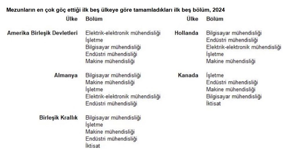 Amerika Birleşik Devletleri’ne göç eden mezunlar içinde en büyük paya sahip lisans programı elektrik-elektronik mühendisliği olurken, Almanya, Birleşik Krallık ve Hollanda’yı en fazla tercih eden mezunlar bilgisayar mühendisliği bölümünden oldu. Kanada’ya göç etmeyi tercih eden mezunlar arasında en fazla paya sahip olan lisans programı işletme oldu.