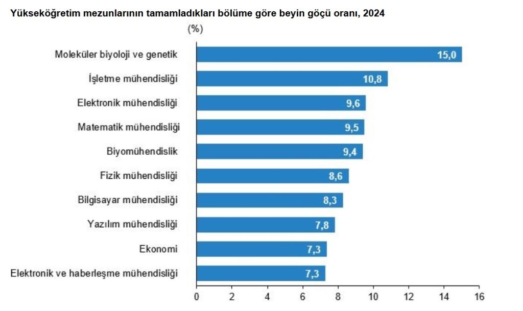 Mezunların beyin göçü oranları incelendiğinde, en yüksek beyin göçü oranına sahip lisans programları sırasıyla, moleküler biyoloji ve genetik (%15,0), işletme mühendisliği (%10,8), elektronik mühendisliği (%9,6), matematik mühendisliği (%9,5) ve biyomühendislik (%9,4) oldu.