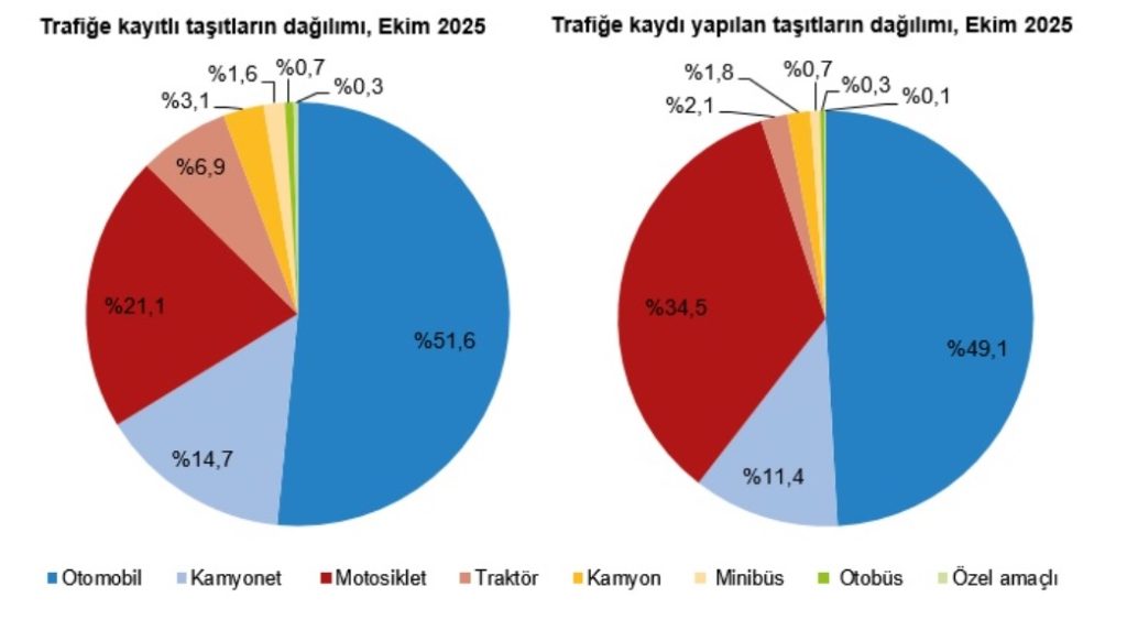 Ekim ayında trafiğe kaydı yapılan taşıtların %49,1’ini otomobil, %34,5’ini motosiklet, %11,4’ünü kamyonet, %2,1’ini traktör, %1,8’ini kamyon, %0,7’sini minibüs, %0,3’ünü otobüs ve %0,1’ini özel amaçlı taşıtlar oluşturdu.