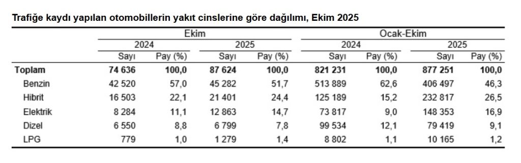 Ocak-Ekim döneminde trafiğe kaydı yapılan 877 bin 251 adet otomobilin %46,3’ü benzin, %26,5’i hibrit, %16,9’u elektrikli, %9,1’i dizel ve %1,2’si LPG yakıtlıdır. Ekim ayı sonu itibarıyla trafiğe kayıtlı 17 milyon 117 bin 983 adet otomobilin ise %32,9’u dizel, %30,8’i benzin, %30,5’i LPG, %3,6’sı hibrit ve %1,9’u elektriklidir. Yakıt türü bilinmeyen(3) otomobillerin oranı ise %0,2’dir.