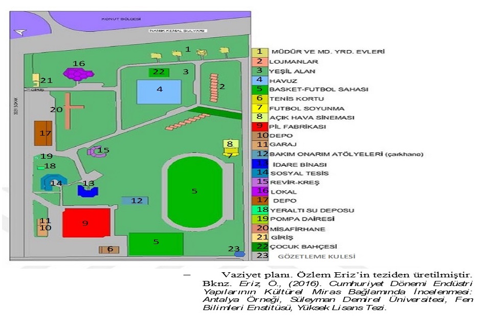 Bu çerçevede 1974’te kurulan Antalya Pil Fabrikası Yerleşkesi, mimari, yapısal, teknolojik ve sosyal özellikleriyle Antalya’nın önemli bir endüstri mirasıdır. Yerleşke; prefabrik betonarme taşıyıcı sistem, katlanmış plak çatı, güneş kırıcılar, gün ışığı fenerleri, avlulu plan düzeni ve yağmur suyu toplama havuzu gibi dönemin modern tasarım ilkelerini yansıtan niteliklere sahiptir. Lojmanları, kreşi, sosyal tesisleri, yüzme havuzu, spor alanları ve açık hava sinemasıyla yalnızca bir üretim alanı değil, dönemin bütüncül yaşam–işlev anlayışını yansıtan örnek bir Cumhuriyet dönemi sanayi yerleşkesidir. Antbirlik, Pamuklu Dokuma, Kepez Elektrik ve Ferro-Krom tesisleriyle birlikte 1950’lerden itibaren gelişen Fabrikalar Bölgesi’nin tamamlayıcı bir bileşeni olarak, kentin endüstriyel gelişimine ve sosyal yaşamına önemli katkı sunmuştur.