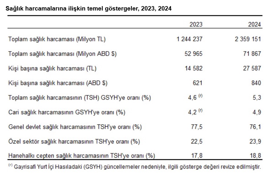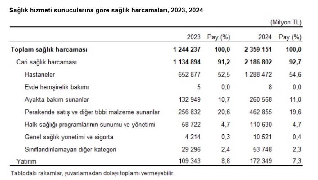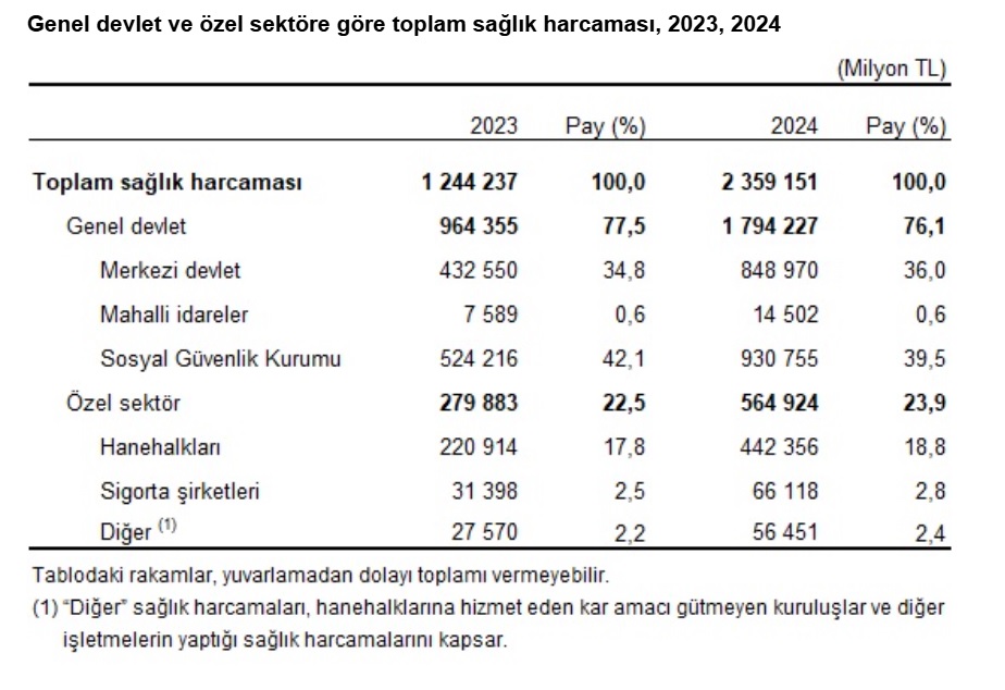 Toplam sağlık harcaması 2024 yılında bir önceki yıla göre %89,6 artarak 2 trilyon 359 milyar 151 milyon TL’ye yükseldi. Genel devlet sağlık harcaması %86,1 artarak 1 trilyon 794 milyar 227 milyon TL’ye ulaştı. Özel sektör sağlık harcaması ise %101,8’lik bir artış oranı ile 564 milyar 924 milyon TL olarak tahmin edildi.