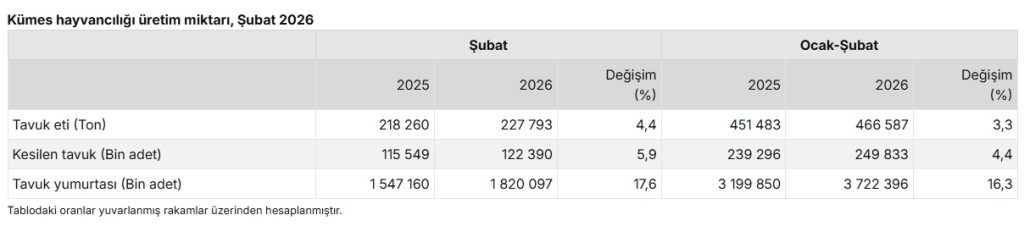 Şubat ayında bir önceki yılın aynı ayına göre, tavuk yumurtası üretimi %17,6 arttı, kesilen tavuk sayısı %5,9 arttı, tavuk eti üretimi %4,4 arttı. Ocak-Şubat döneminde bir önceki yılın aynı dönemine göre, tavuk yumurtası üretimi %16,3 arttı, kesilen tavuk sayısı %4,4 arttı, tavuk eti üretimi %3,3 arttı.