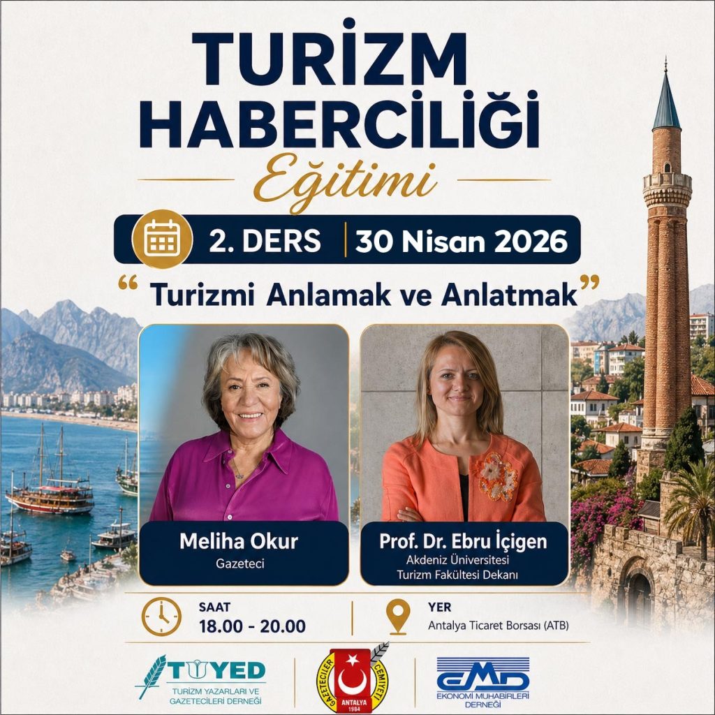 Turizm Haberciliği Eğitimi’nin ikinci dersinde usta gazeteci ve televizyoncu Meliha Okur ile Akdeniz Üniversitesi Turizm Fakültesi Dekanı Prof. Dr. Ebru İçigen “Turizmi Anlamak ve Anlatmak” konulu dersle habercilerin ve muhabir adaylarının karşısında olacak.