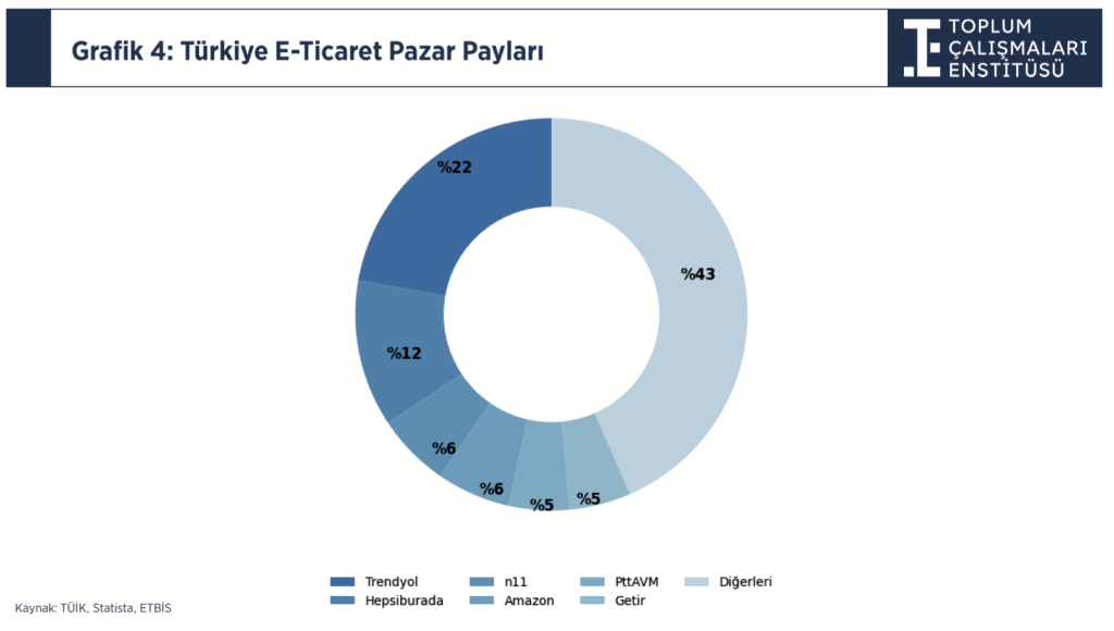 Türkiye e-ticaret pazarında platform bazlı dağılıma ilişkin verilerde Trendyol’un yaklaşık yüzde 22, Hepsiburada’nın yaklaşık yüzde 12, n11’in yaklaşık yüzde 6, Amazon’un yaklaşık yüzde 6, PttAVM’nin yaklaşık yüzde 5, Getir’in yaklaşık yüzde 5, “Diğerleri” kategorisinin ise yüzde 43 paya sahip olduğu kaydedildi. Toplum Çalışmaları Enstitüsü’nün raporunda, “diğerleri” kategorisindeki aktörlerin büyük bölümünün tüketiciye erişimde dijital reklam kanallarına bağımlı olduğu ifade edildi.