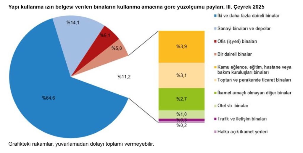 2025 yılı III. çeyreğinde yapı kullanma izin belgesi verilen binaların kullanma amacına göre en yüksek yüzölçüm payına 21,5 milyon m² ile iki ve daha fazla daireli ikamet amaçlı binalar sahip oldu. Bunu 4,7 milyon m² ile sanayi binaları ve depolar izledi.