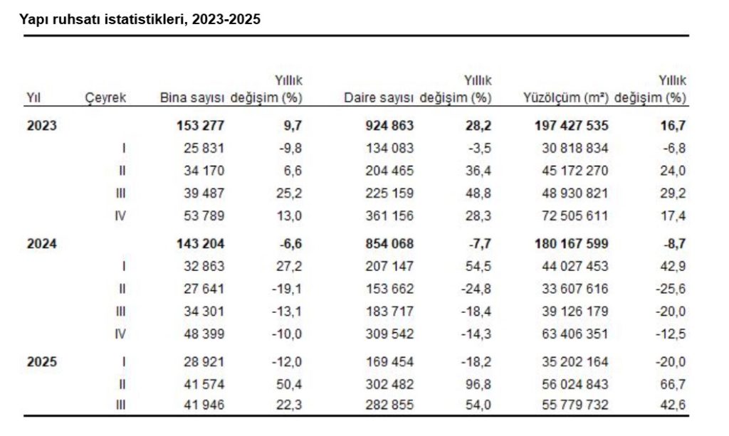 Mevsim ve takvim etkilerinden arındırılmış serilerde ise, bir önceki çeyreğe göre, 2025 yılı III. çeyreğinde yapı kullanma izin belgesi verilen bina sayısı %2,7 azaldı, daire sayısı %0,5 azaldı ve yüzölçüm %3,7 arttı.