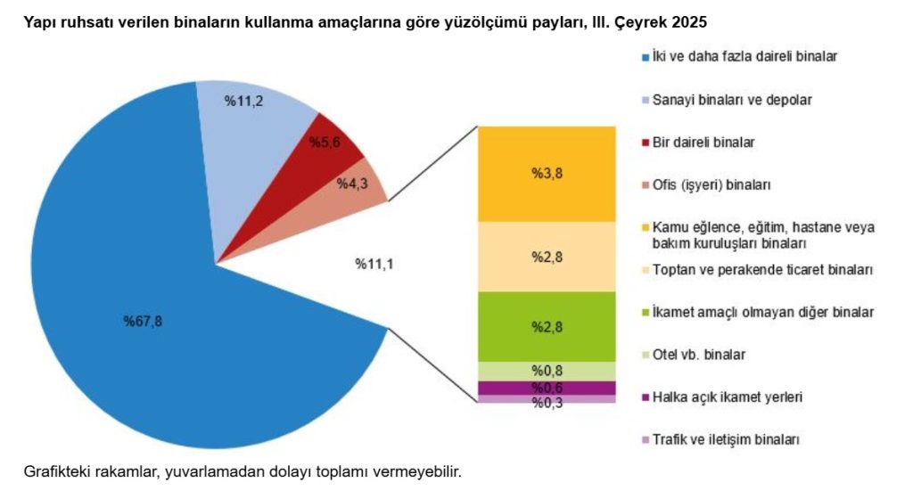 2025 yılı III. çeyreğinde yapı ruhsatı verilen binaların kullanma amacına göre en yüksek yüzölçüm payına 37,8 milyon m² ile iki ve daha fazla daireli ikamet amaçlı binalar sahip oldu. Bunu 6,2 milyon m² ile sanayi binaları ve depolar izledi.