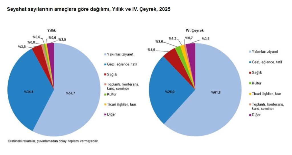 Seyahate çıkış amaçları çeyreklik olarak incelendiğinde ise %61,8 ile “yakınları ziyaret’ birinci sırada yer alırken, ikinci sırada %26 ile “gezi, eğlence, tatil”, üçüncü sırada ise %4,9 ile “sağlık” amacıyla yapılan seyahatler yer aldı.