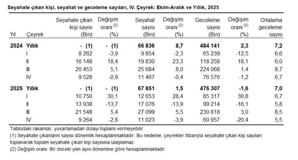 Seyahat sayısı 2025 yılında bir önceki yıla göre %1,5 artarak 67 milyon 851 bin olarak gerçekleşti. Bu yılda seyahate çıkanların yaptıkları toplam geceleme sayısı bir önceki yıla göre %1,6 azalarak 476 milyon 307 bin olarak gerçekleşti. Ortalama geceleme sayısı 7 gece oldu.