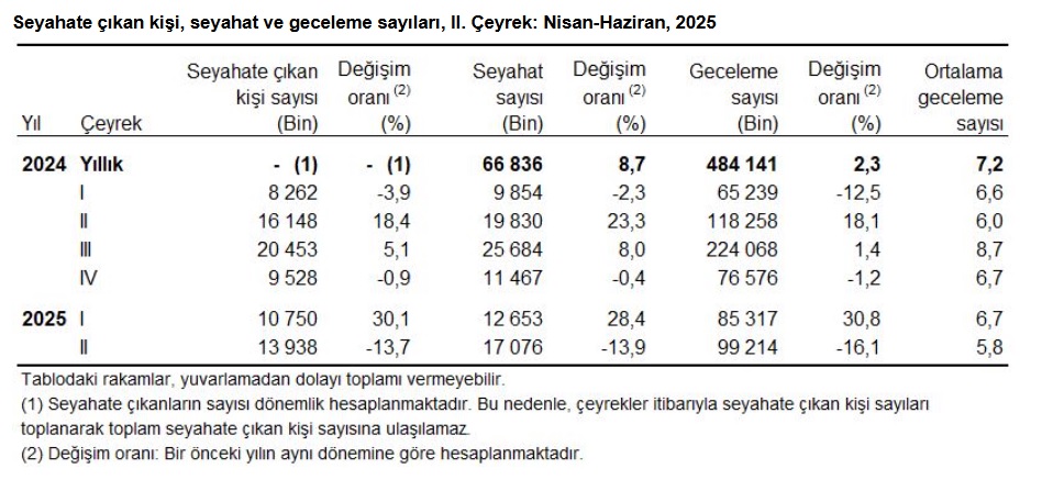 |Nisan, Mayıs ve Haziran aylarından oluşan II. çeyrekte, yurt içinde ikamet eden 13 milyon 938 bin kişi seyahate çıktı. Seyahate çıkanların bir ve daha fazla geceleme kaydı ile ülke içinde yaptıkları toplam seyahat sayısı bir önceki yılın aynı çeyreğine göre %13,9 azalarak 17 milyon 76 bin seyahat olarak gerçekleşti. Bu çeyrekte seyahate çıkanlar 99 milyon 214 bin geceleme yaptı. Ortalama geceleme sayısı 5,8 gece oldu.