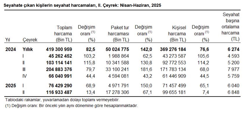 Yerli turistlerin, yurt içinde yaptıkları seyahat harcamaları 2025 yılının II. çeyreğinde bir önceki yılın aynı çeyreğine göre %13,4 artarak 116 milyar 933 milyon 487 bin TL olarak gerçekleşti. Bu harcamaların %85,2’sini 99 milyar 655 milyon 181 bin TL ile kişisel harcamalar, %14,8’ini ise 17 milyar 278 milyon 306 bin TL ile paket tur harcamaları oluşturdu. Seyahat başına yapılan ortalama harcama ise 6 bin 848 TL oldu.