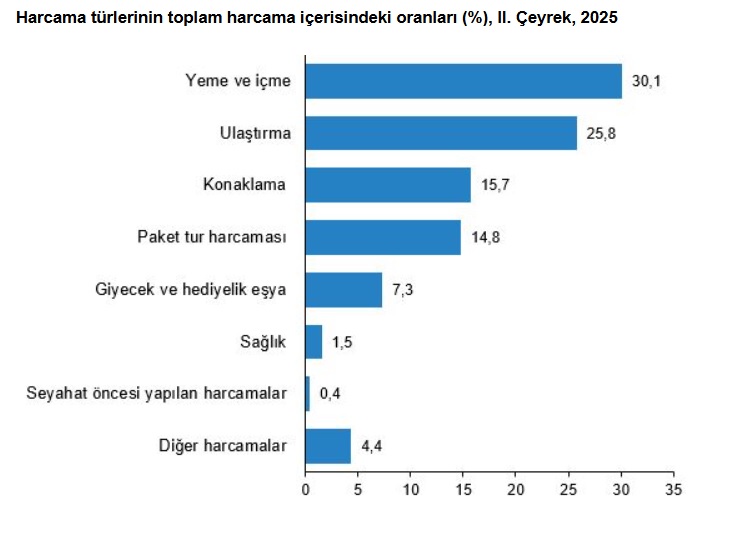 Bu çeyrekte harcama türlerinin toplam seyahat harcamaları içinde dağılım oranları incelendiğinde en fazla paya %30,1 ile yeme ve içme harcamaları, %25,8 ile ulaştırma harcamaları ve %15,7 ile konaklama harcamaları sahip oldu. Bu harcama türlerinin geçen yılın aynı dönemine göre değişim oranları incelendiğinde ise yeme ve içme harcamalarında %3,1, ulaştırma harcamalarında %7,1 ve konaklama harcamalarında ise %26,2’lik artış görüldü.