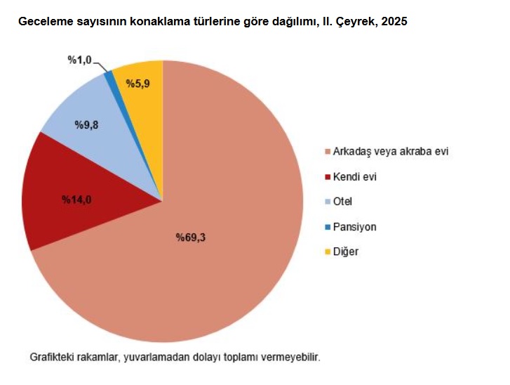 Bu çeyrekte seyahate çıkanlar 68 milyon 739 bin geceleme sayısı ile en çok “arkadaş veya akraba evinde” kaldı. Konaklama türlerine göre geceleme sayısında ikinci sırada 13 milyon 886 bin geceleme ile “kendi evi” yer alırken, “otel” 9 milyon 727 bin geceleme sayısı ile üçüncü sırada yer aldı.