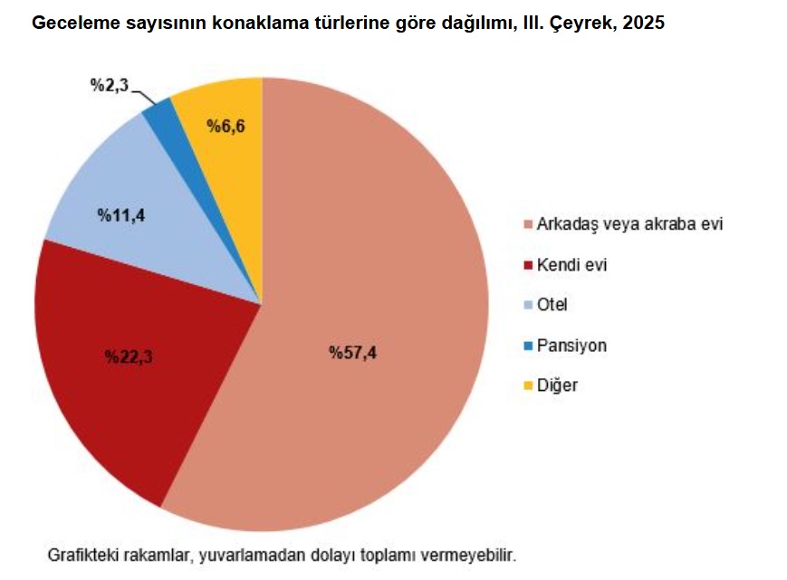 Bu çeyrekte seyahate çıkanlar 132 milyon 394 bin geceleme sayısı ile en çok “arkadaş veya akraba evinde” kaldı. Konaklama türlerine göre geceleme sayısında ikinci sırada 51 milyon 509 bin geceleme ile “kendi evi” yer alırken, “otel” 26 milyon 348 bin geceleme sayısı ile üçüncü sırada yer aldı.