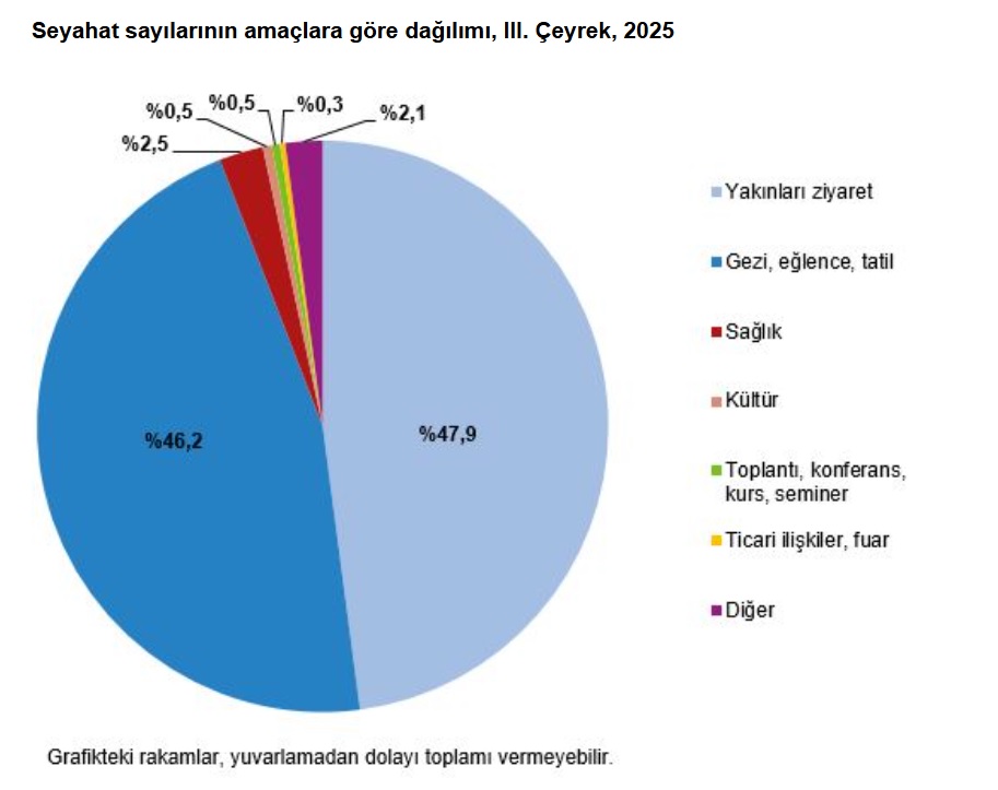 Seyahate çıkış amaçlarında ikinci sırada %46,2 ile “gezi, eğlence, tatil”, üçüncü sırada ise %2,5 ile “sağlık” yer aldı.