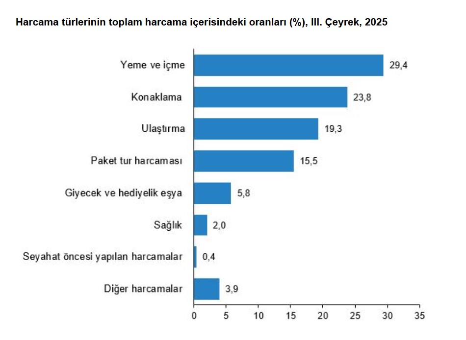 Bu çeyrekte harcama türlerinin toplam seyahat harcamaları içinde dağılım oranları incelendiğinde en fazla paya %29,4 ile yeme ve içme harcamaları, %23,8 ile konaklama harcamaları ve %19,3 ile ulaştırma harcamaları sahip oldu. Bu harcama türlerinin geçen yılın aynı dönemine göre değişim oranları incelendiğinde ise yeme ve içme harcamalarında %31,6, konaklama harcamalarında %54,6 ve ulaştırma harcamalarında ise %25,7’lik artış görüldü.