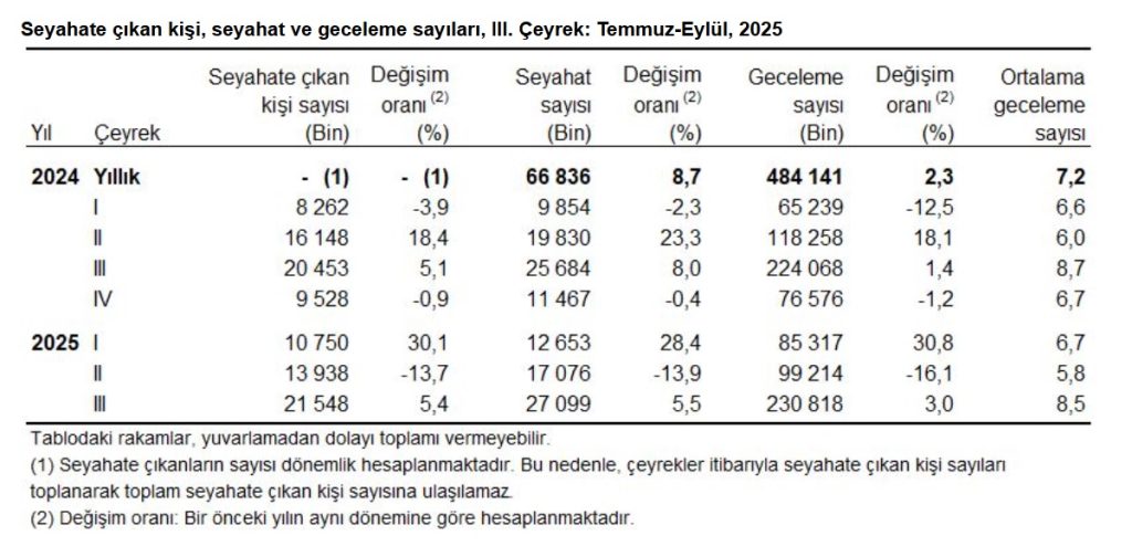 Temmuz, Ağustos ve Eylül aylarından oluşan III. çeyrekte, yurt içinde ikamet eden 21 milyon 548 bin kişi seyahate çıktı. Seyahate çıkanların bir ve daha fazla geceleme kaydı ile ülke içinde yaptıkları toplam seyahat sayısı bir önceki yılın aynı çeyreğine göre %5,5 artarak 27 milyon 99 bin seyahat olarak gerçekleşti. Bu çeyrekte seyahate çıkanlar 230 milyon 818 bin geceleme yaptı. Ortalama geceleme sayısı 8,5 gece oldu.